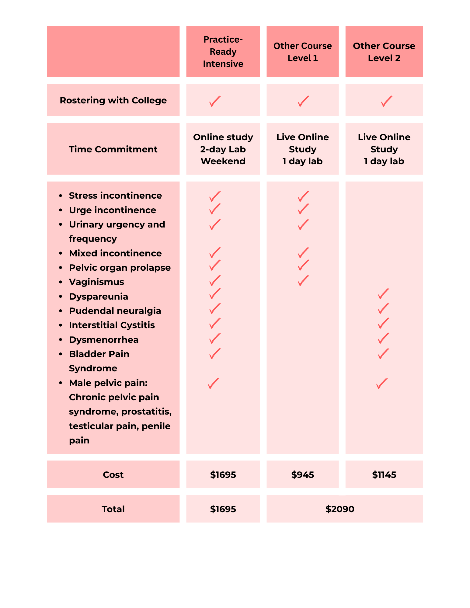 Many pelvic health programs require clinicians to complete multiple levels before feeling clinically prepared. This course combines the key foundational material typically covered in Level 1 and Level 2 training, allowing you to build a strong clinical base in one structured program.